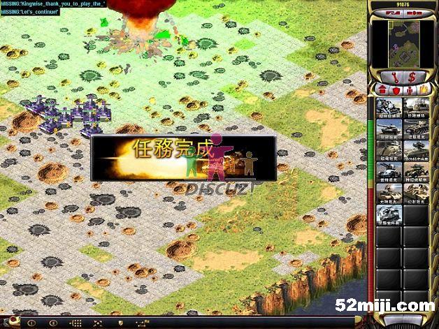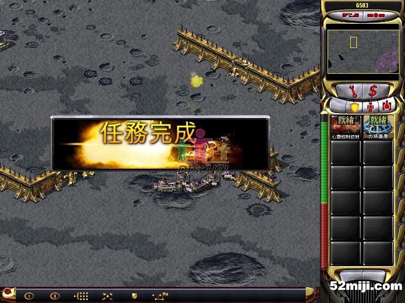 打爆围墙后,BORI把遥控坦克干掉,然后和ZERRAT把围墙内的兵和建筑物干掉,尤里X和飞碟消灭和控制外围巡逻的坦克,用坦克打烂围墙,解放被困的人和坦克出去。然后利用ZERRAT不会被别人打,随意攻击的情况一路去扫平所有的盟军建筑和兵,其它用飞碟和坦克等消灭,然后救出总部车,用尤里X控制船厂造一架运兵船,家里要做好防空,因为不断有敌机和飞行兵过来,建议控制巡洋舰,防空好。用尤里X去控制航母消灭海边的防守后,运兵船送人和坦克上岸,老办法消灭岛上的力量后工程师修桥,消灭美国这边的所有防御,工程师占领兵营和车场等建筑,矿车采矿,直升机送工程师占油井。要注意占高科技后,会在右上角刷新美军进攻你,要放飞碟和光凌去防守,然后修桥,打过总部去,还是用ZERRAT吧,到里面狂轰乱炸,只要不要炸到核电厂,不然他会一命呜呼的,炸完了就光凌过去收拾一下残局,OK过关。这关容易过