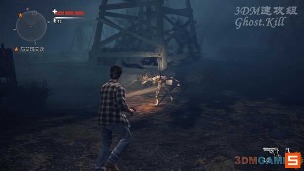 场景又回到了第一关,路线不变,前往汽车旅馆的车库找艾玛。路上遇到新敌人,成群的乌鸦落地之后变成一个人形,攻击他之后又会变成乌鸦飞走,再等变回人形继续攻击,干掉为止。