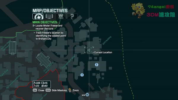 现在要更具屏幕显示的温度,去需找急冻人。距离越近,显示的温度越低,往右上角走!如图显示的位置,解决掉附件的小兵,地下有一个共用电话,用空格键接听!接到电话后,往回走一点,有一个卷帘门,用电磁枪打开一下,然后跑起来,按下CTRL从下面滑过去!进去一下,往下走几步,走到大门那里,蝙蝠侠会拿出破解器,把鼠标移动黄点的位置,然后左键监听!