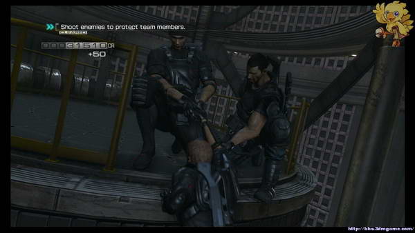 然后和队友一起返回到,电梯处,这时候进入动画,上放管道出现很多机器人,守住,进入电梯,过程中,一名队友被机器人抓住,用手枪打机器人,解救队友通过第二章。