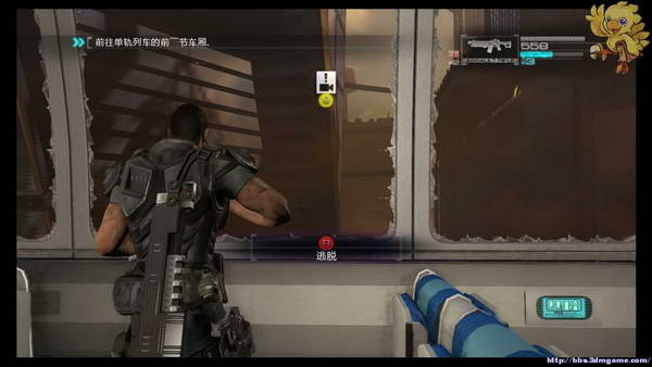 动画完后会提示你破坏门,,瞄准的红色锁心地方射击,然后是QTE,撞开后跳下火车,敌人围攻,清理完后跟着队友下地铁里面,