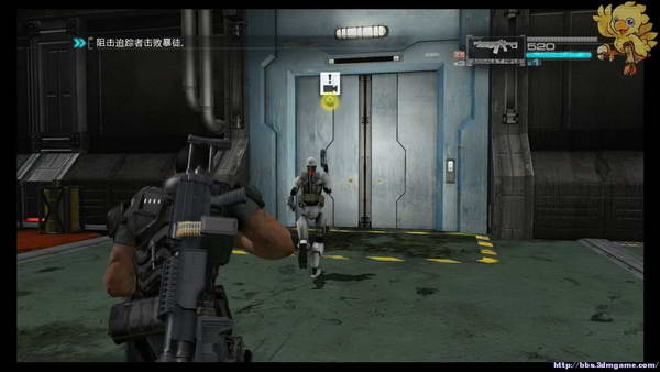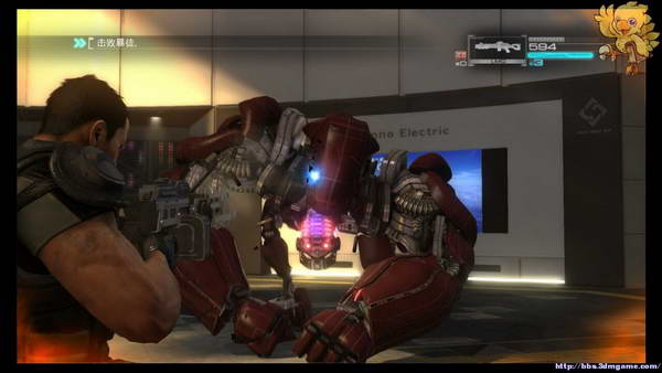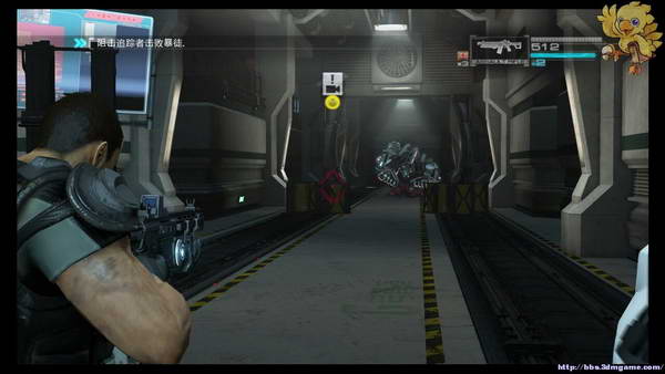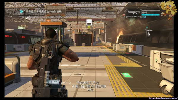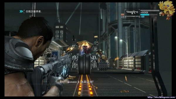 下去后小心前方会有狙击手,第一时间打掉,直杀到看到有GS字样的大门处,动画完后刚才的boss又杀回来了,这次不是打他头,此次分为3个阶段,第1阶段是打油桶击晕boss,然后打头。