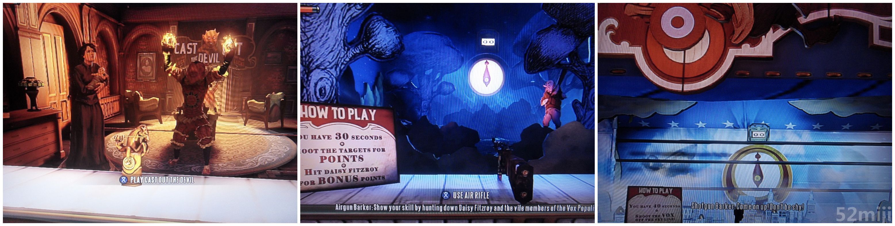 途中会来到一个游园,参加“Hunt down the Vox”(击倒标靶);“Cast ot the devil”(在3次不击中妇人的情况下击中恶魔,按LT发射);“Sky-line Vox”(利用来复枪射击靶子)