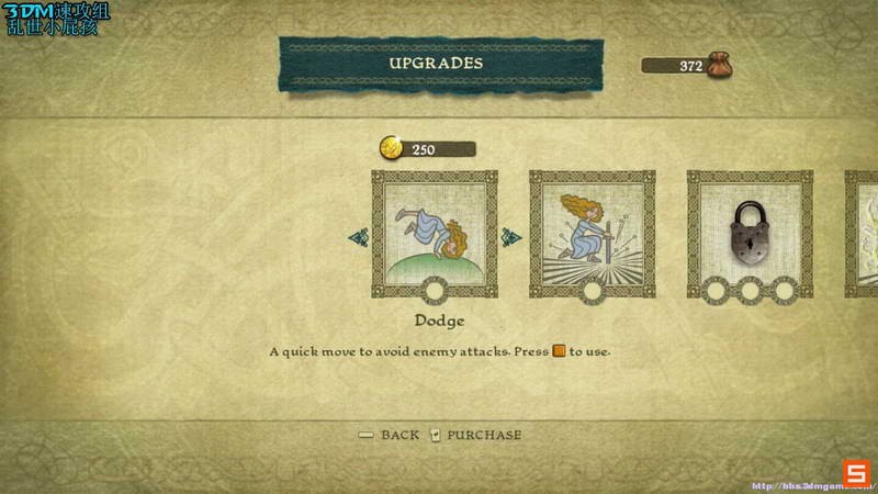 走一段路后遇到狼,还是老方法,射之! 然后一路走下来,跑到一块紫色的石头这里,然后会出现一堆狼,射死后就可以用石头升级首先学习第一个,即躲避,这个技能到后面很有用。