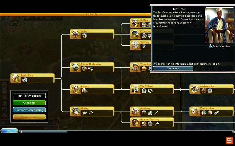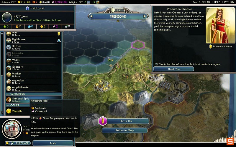游戏的整体布局没有改变很大,大体遵循原版CIV5的模式。帮助系统由四顾问分别进行提示,当然你也可以再游戏设置里面进行关闭。上边栏则是你的游戏资源详细状况