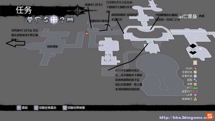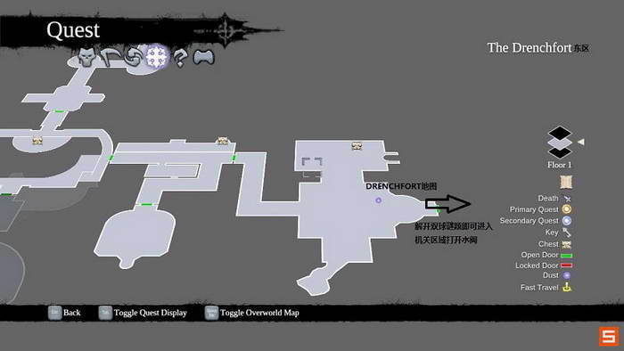 来到DRENCHFORT,首先来到地图的东部,解开这里的双球谜题。DRENCHFORT你的主要目的是打开两边的水闸,从而让中间的区域注满水流,打开通往南部中间房间的道路。注意东区的地图不要忘记拿了