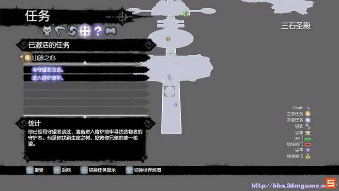 大体的流程如下,标注的很清楚。北部东区的房间需要先从水下潜入,然后穿梭来到球体房间,打开石门让卡恩帮助你顶住,然后弹射球体嵌入顶部的凹槽(按鼠标中键)