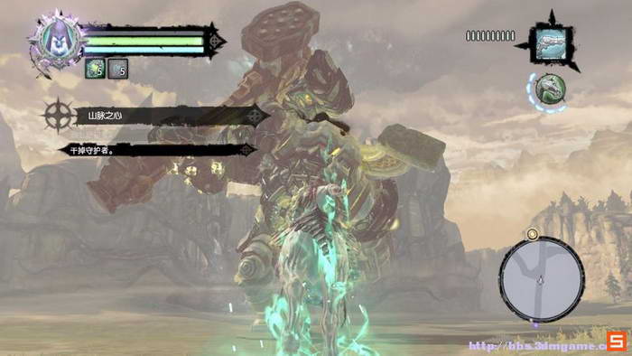 守护者是本章节最难对付的BOSS。这个BOSS战斗分为两个阶段。第一阶段,玩家需要攻击守护者持锤的右臂上的爆炸物(骑马状态下手枪射击),等到右边心石区域掉落之后,用死亡之握飞到晶体之上攻击。重复几次摧毁心石即可完成第一阶段。