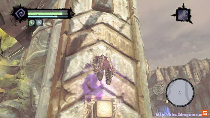 之后快速往守护者的两腿之间冲刺前进,从而当炮弹反过来击倒守护者。之后从守护者的左臂上的阶梯快速爬上,在最高点使用死爪吸附到左边的晶体,然后攻击之