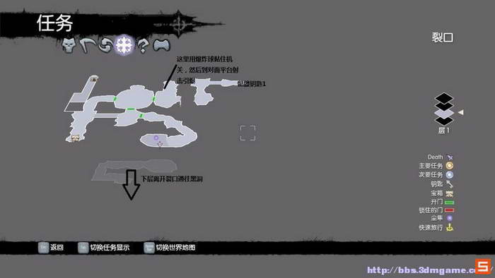 取得最终之魂的难点在于电梯卡主之后,玩家如何在墙壁之上跳跃从而取得爆炸球击毁腐化之体。如下图所示,玩家首先打开第一个栅栏,然后在跳跃之后的第二层平台俯视下方,指引死亡领主踏上对面的第二个机关打开上层的栅栏,从而一路向上打开通往上层的最终道路取得爆炸球