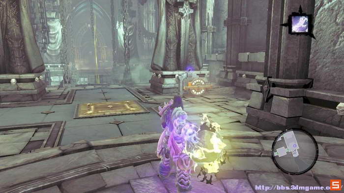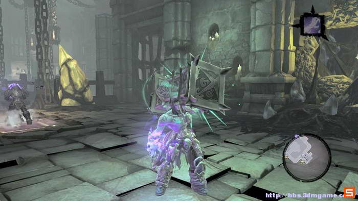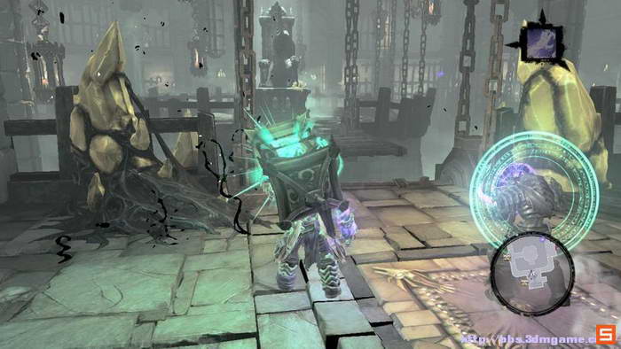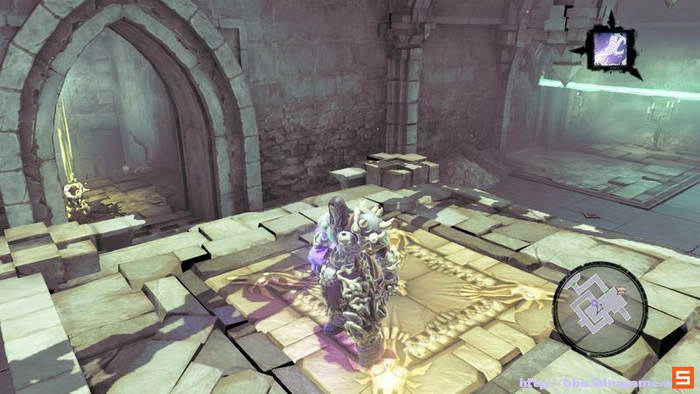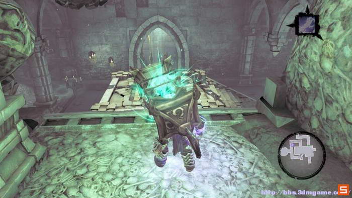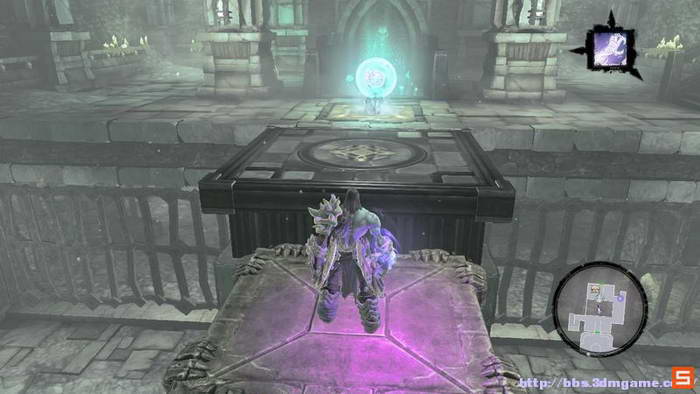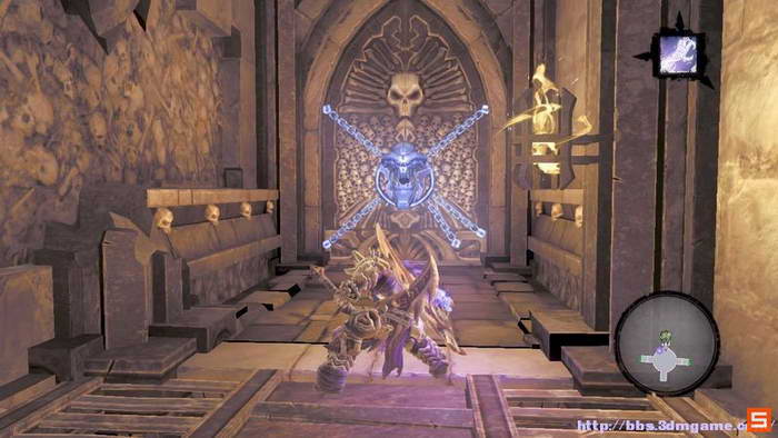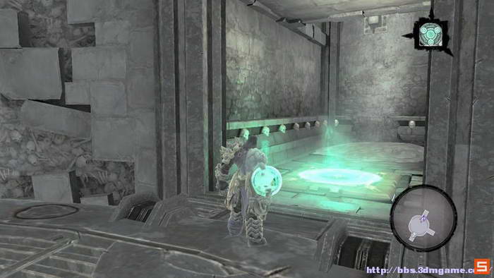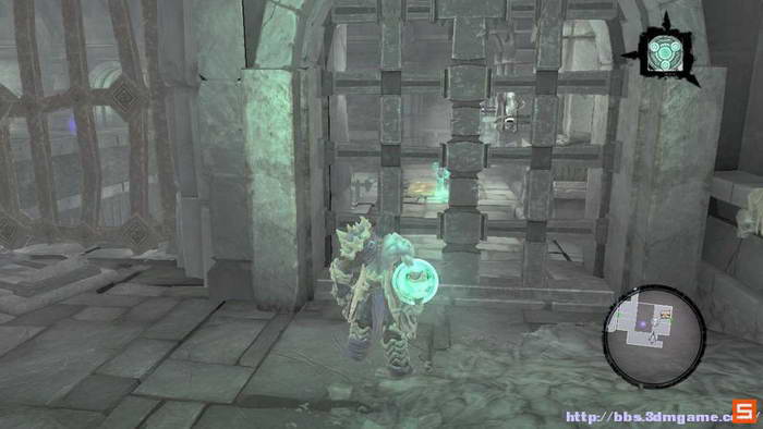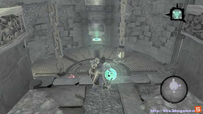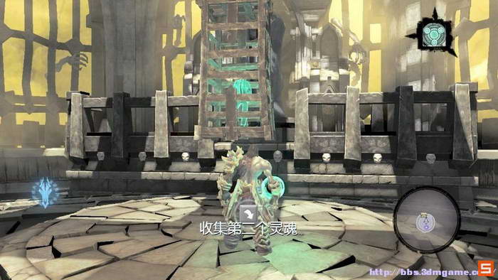 下面来到执法官的墓地。DEATH需要收集三个审判的灵魂,而执法官的墓地入口处的机关如下图所示进行开启,即使分别升起两个高台,然后将柱子吸引到中间跳跃前进