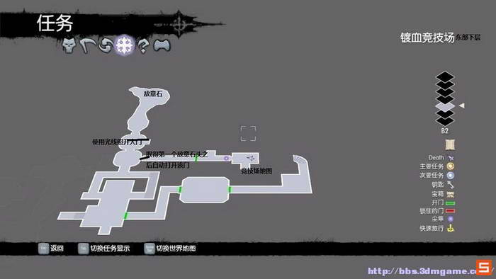 在竞技场,你首先需要取得三个敌意石,才能召唤出最终的竞技场冠军。所以我们整个迷宫的主要路途就是为了获得的意识。首先一路前行,你的第一个目标就是要获得灯,开启灯塔从而照亮门上的标尺打开锁住的门。第一个灯的取得如下,注意沿路你可以得到本区域的地图。