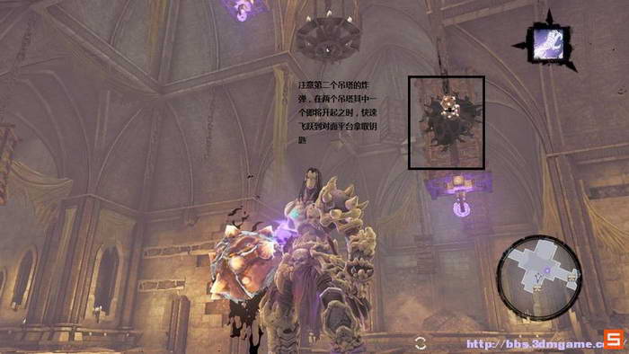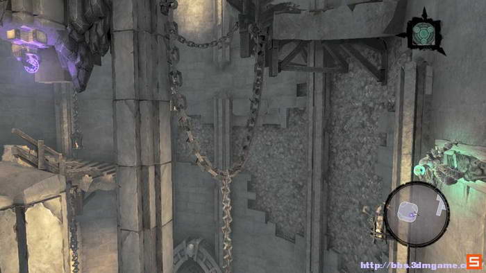 这里则是注意先要将灯压制在机关之上,然后飞跃回到对面的平台,用死爪勾过来