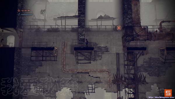 之后往下来到中间废墟区域,从中间的平台跳到对面凹陷的区域