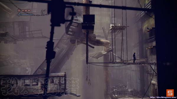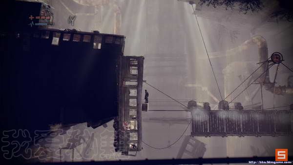 来到碎裂的车厢区域,这里你需要用弹弓射击对面的铁板,然后快速跳上伸出的平台,从而来到最高层