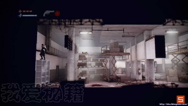 下图所示的杂物间。这里首先需要用柜子堵路;之后站在柜子上沿着上面的障碍飞跃过该场景,躲避掉下面的僵尸群