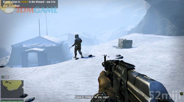 戴上面罩后,不要惊扰帐篷里的士兵,而是往左边绕过去,看到有名士兵在维修雪地麾托,溜到背后刺杀他。驾驶麾托冲下雪坡,这样节省不少的时间。