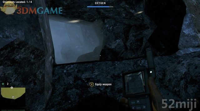 最左边的地点是一座山洞,装备上追踪仪,显示白灯的方向就是正确的,黄灯不正确。山洞昏黑不明,自动亮起头灯,只能看到方圆几米的地方。