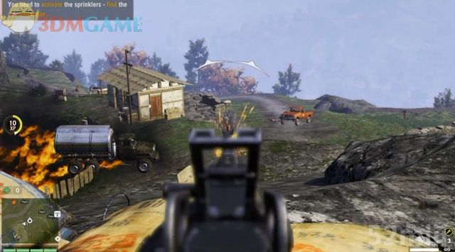 游击队员会跑去保护第一片田地,此时可以回到院落里,操作机枪扫射出现的敌兵。当大火烧起来,用滑索迅速赶到那里。