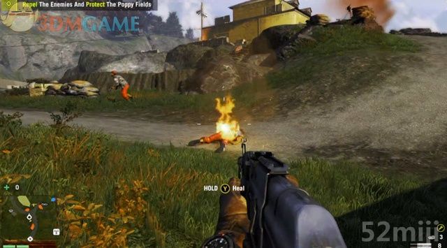 跟随游击队员保护另一片田地,扔燃烧弹的家伙被射中后会四处狂奔,不要被他扑到哦。
