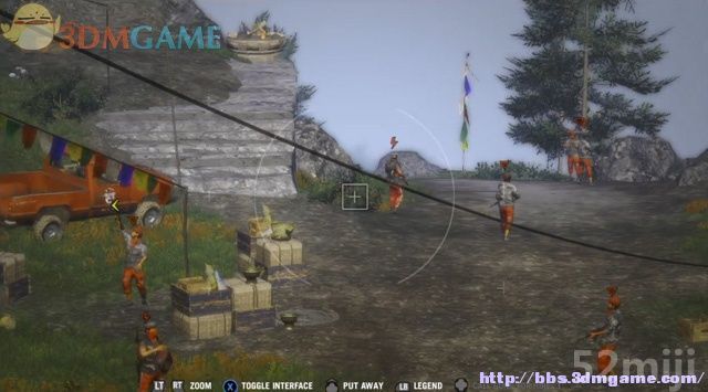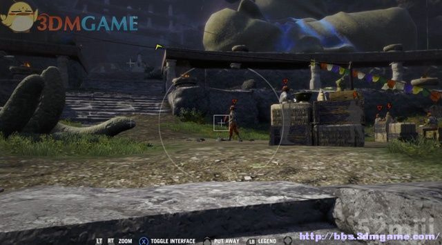 趁广场最近的敌兵转身,立刻朝左边跑过去,攀爬上平台,在这里可以更全面的标记敌人。