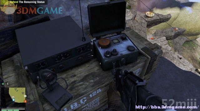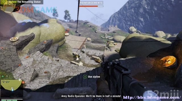 第一种策略。如果你身上有足够的武器槽位,除了常规武器外,能多带一支火箭筒。火箭筒在顶层平台的箱子旁能拾到,带上它立刻滑索道到达那座完好佛像的台座上,这里居高临下,敌人爬上来需要一段时间。