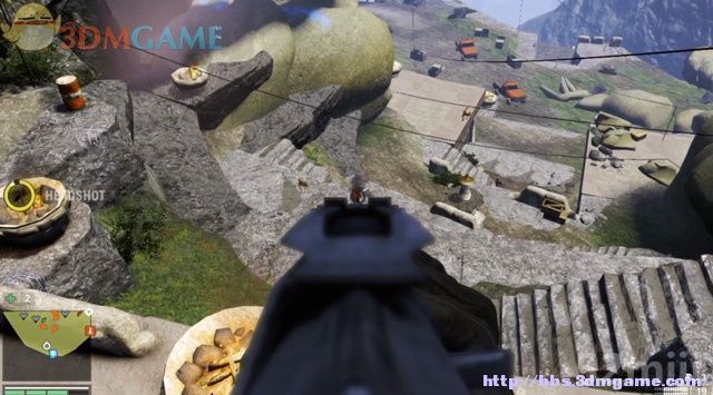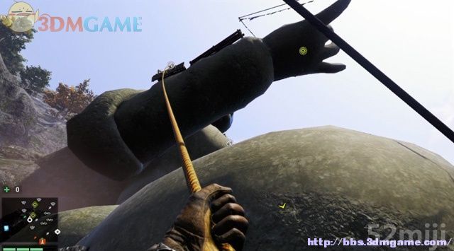 带上火箭筒,用滑索下去后往左边的山崖走,这里有条木制的栈道。用火箭筒朝那块摇摇欲坠的巨石来一发,滚落的石块会将道路给封住。