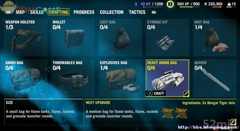 猎取的动物皮张可以制作各种皮包和皮囊,它们多是与背负的容量相关。比如武器槽、钱袋、掠劫背包、针剂包、肉块包、弹药包等。