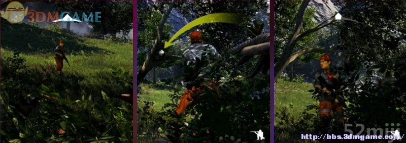 4:掩藏。潜行时利用草木、掩体或潜入水中来掩藏身形。当你被敌人看到时,在警报拉响之前果断撤退,或直接上前击毙敌人。