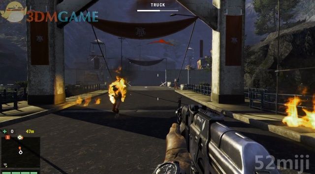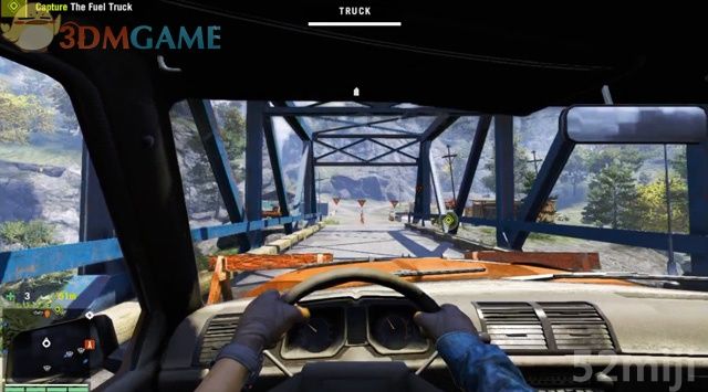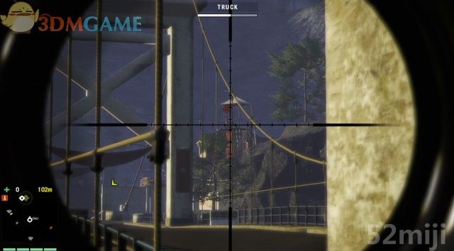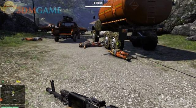 油罐车在桥头的一座据点里,这里可站到桥的另一边用狙击步枪清除据点里的士兵,或者由桥下潜行过去,当然最直接的办法是驾车冲过桥梁和据点,再回身清除里面的敌人,然后夺取车辆。