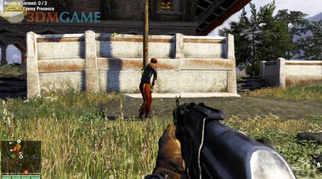 再潜行到右侧的墙后,这边院落里有2名士兵,其中一名是站在固定位置的,而另一名会由这边往主殿绕圈巡逻,所以有时在这里只能见到一名。