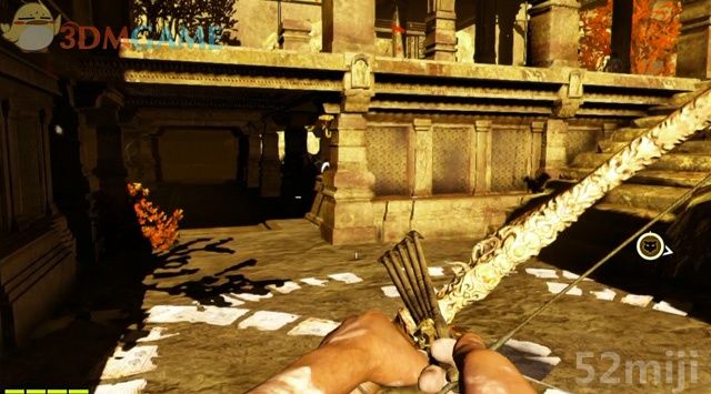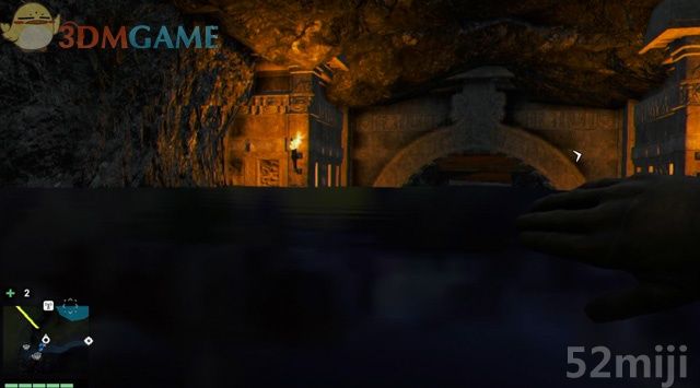 用绳索爬到下面的石台,进到山洞拾取一封失落的信件。继续往下爬,落身到水潭中,望到前方神庙的入口。