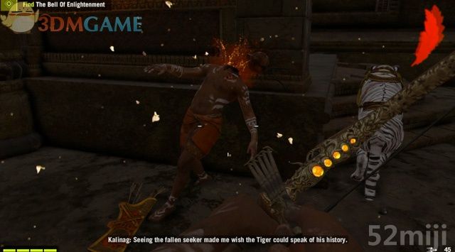 清完大厅的敌人,白虎会蹲在一具探求者的尸体旁,从尸体上拾取饰品,凯加林的血格+1。本关共有三名这样的探求者,每找到一名会增加一格血量上限,目前还剩余两名。