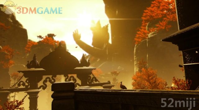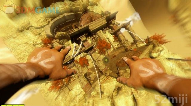 旋转第二只经轮,看到远处的神像双臂都举了起来,接着再通过莲花座朝着神像下方的陆地飞过去。