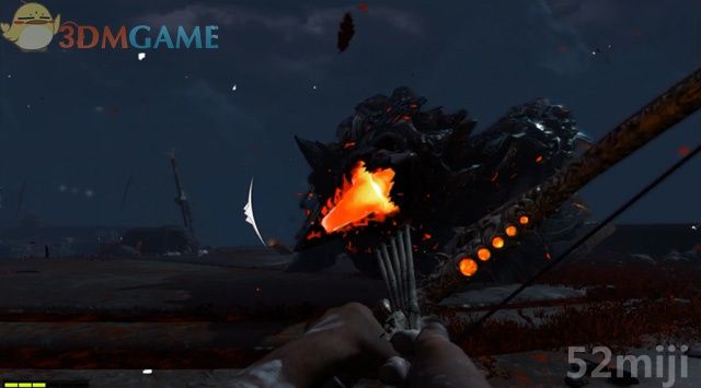 重复此前的操作,在它张嘴要吐火球的时候朝口腔射箭,射中三次它会再次跌落陆地。