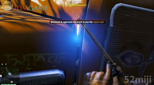 冲过这里的关卡,卡车受损严重。跳下卡车进行维修,将它的血槽补满。