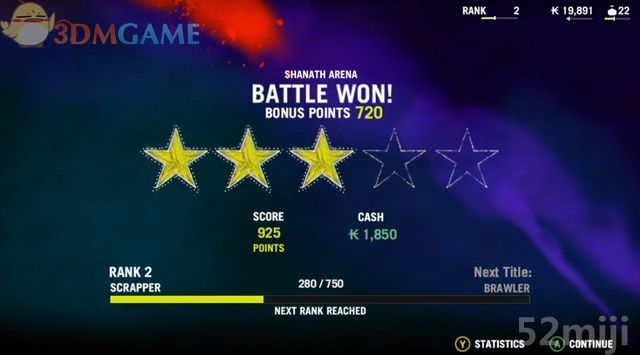 战斗结束,进入统计表单,显示获得的点数、评价和称号等。