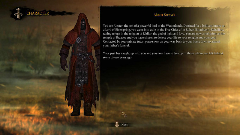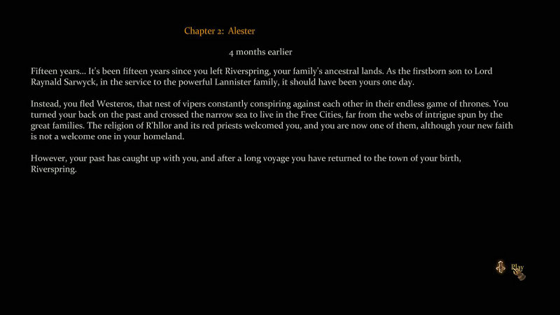 Alester Sarwyck,十五年前曾经的Riverspring帝王的长子,现今的一名RED PRIEST,因为你父亲的葬礼 而不得不回到家乡参加,背负着十五年前过去的种种包袱,重新找回属于你自己的地位