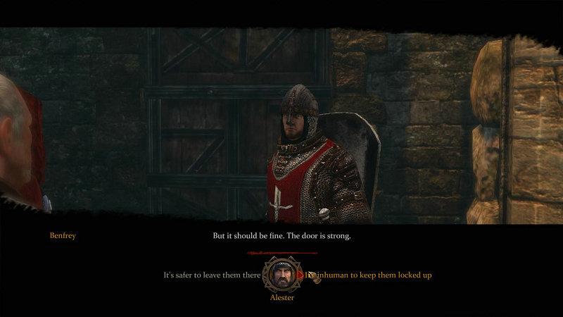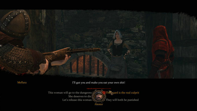 然后来到南部的码头处,这里有四个待处决的市民,他们因为种种罪行现在而待被处决。你可以询问守卫或者市民来试图找寻其中的真相,但是无论如何 你还是得选择是放市民走还是处决