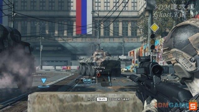 来到大街上继续向前杀,小心远处建筑的狙击手,敌人的载具按3使用用榴弹炸掉,一炮足以。