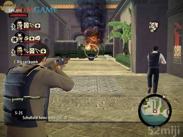 目标位于海岸的城堡里,在大门会遭遇军人和家族武装两股力量,和小弟紧密的团结在一起突破大门。进去后是条街道,两侧的车库正好做掩体用。这里有两条路可走,如果沿街道直行到中庭,会遇到很强的阻击火力,突破的难度较大。另一条路是在街道左侧割开一道铁丝网,沿阶梯上去绕到城堡两幢大楼的后面,炸开一堵墙壁来到主楼旁,派盗贼开锁进入一层的餐厅,找楼梯到二层书房杀教父,然后到外面阳台放炸弹。