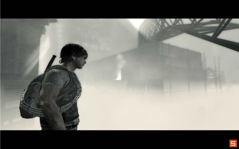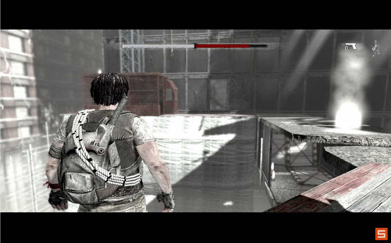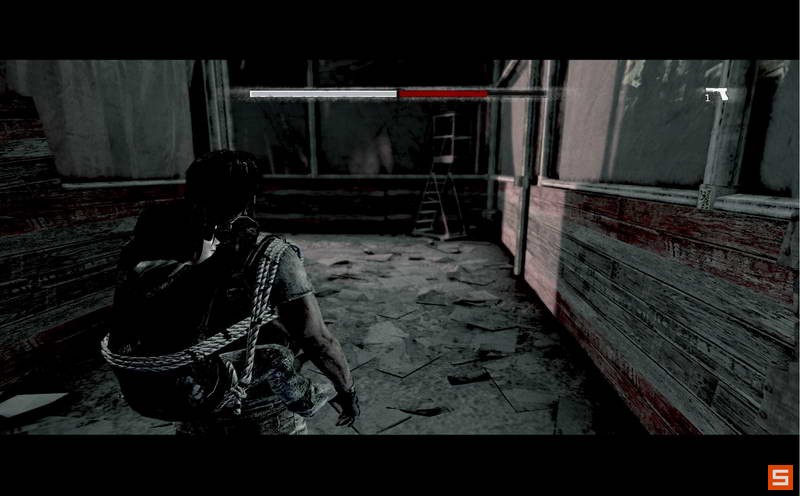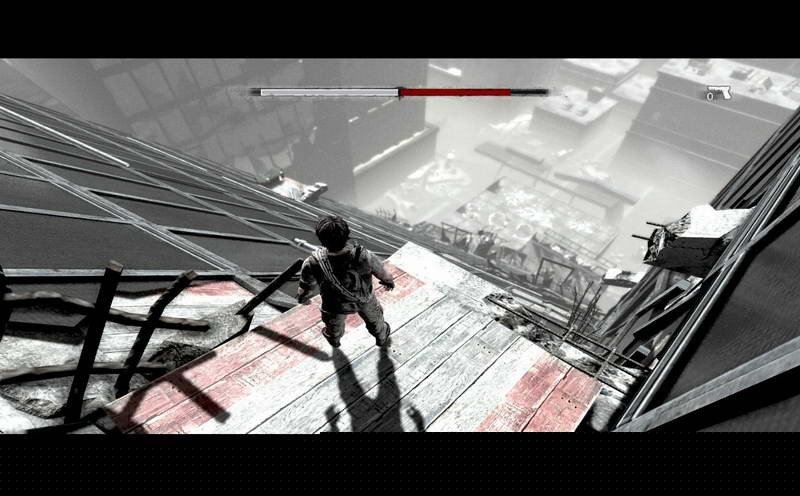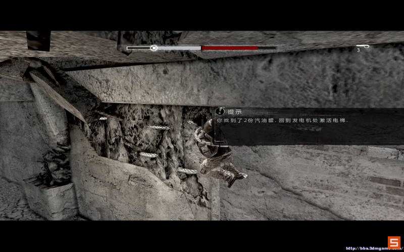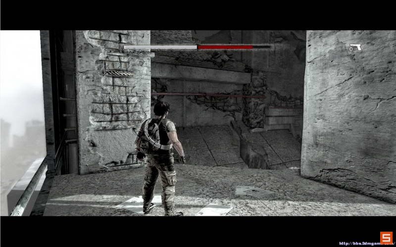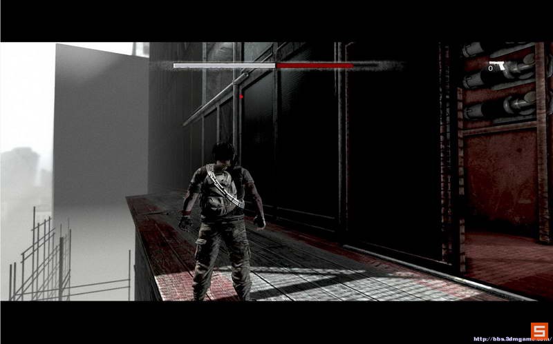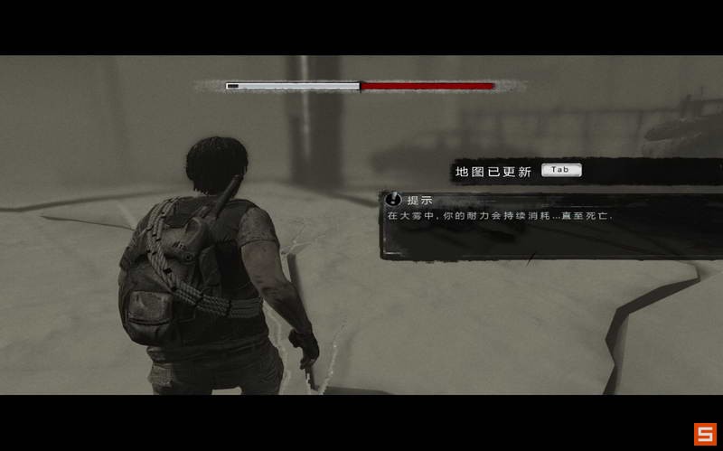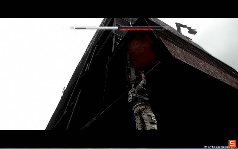 连冲3个大坡后,来到大雾内。(注意:大雾会消耗耐力)爬上桥,沿着桥走看见建筑物,进到建筑物一直往上爬,遇见3名敌人两名拿枪一名拿刀,杀死敌人。