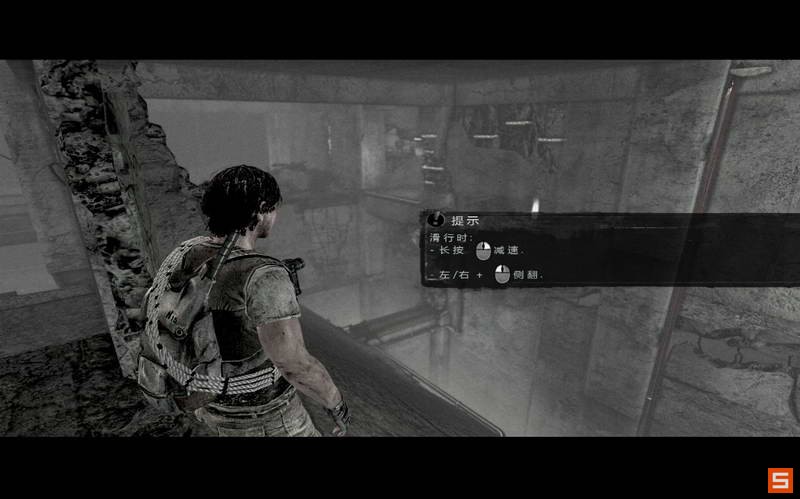 冲坡下来后往右走,看过抓钩(按E跳过去)的地方,然后爬到建筑物。