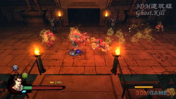 这一关敌人基本都是扔炸弹的,和上一关的不一样,血更厚,攻击性更强,扔炸弹频率更高,但也不是太难打。像图中这种身上冒烟的要小心,自爆的敌人向来是最恶心的,一个劲地跑吧,等杂兵都死光后房间里的两个石像会活动起来,也是伪BOSS,攻击方式就是挥动武器,很容易防御,血也不多,两个都干掉过关。