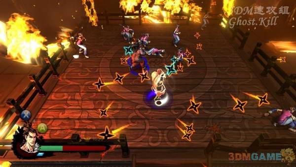 除此之外还要装备那把提高远程防御的扇子。一开始的敌人都是扔飞镖的,不要防御,效率太低,直接攻击把成片的飞镖打回去,一有气就放吸血必杀。