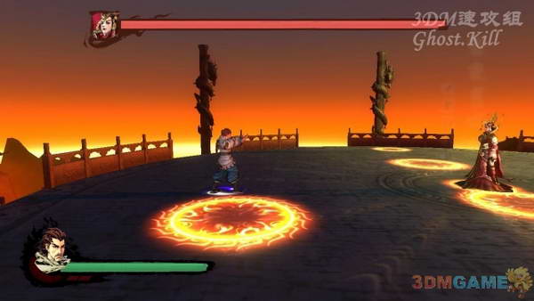 终于到了最终BOSS战了,不要进入地上圆圈的范围内,无论空中还是地上,在里面呆上一秒就会中招,和之前的方丈的阵差不多,不过这个移动更快,超难躲开,打BOSS几下后立刻闪开,等气满了放必杀,打掉十分之一的血后会出杂兵。