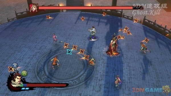 杂兵虽然碍事,但有助于集气,BOSS再使用圆阵的时候会进入放必杀的状态,也就是说能用必杀破掉。杀杂兵集气,等BOSS放必杀后过去破掉,再集气,重复几次等BOSS快没血了后杂兵全部离开,场景又变回了关卡开始时的样子。