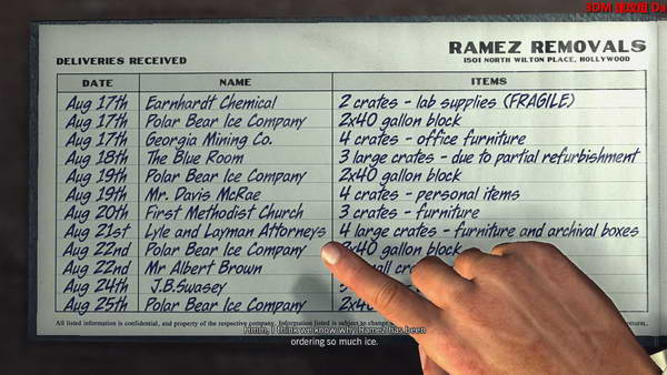 进去冰冻室把冰打破,检查线索!去到大门口绿色台灯的桌子,有个账本,指着上图的位置就可以发现线索