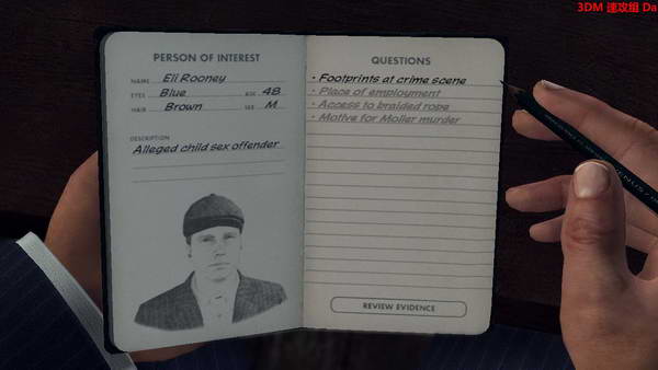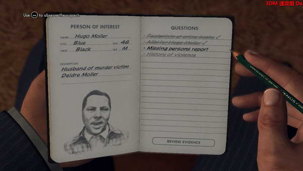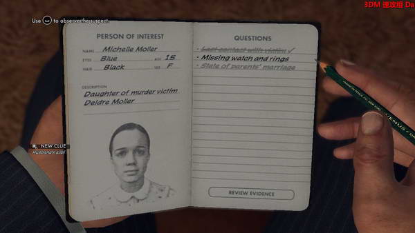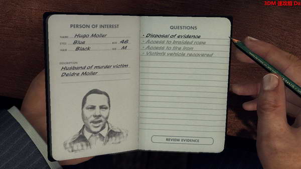 过来到二号审问室。审问Moller,以上图的顺序:1-2-3-3 第三个问题(Bloody tire iro) 第四个问题(Overalls)指证