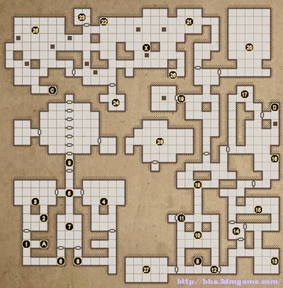 进入(27)前或后你回来,寻找一个隐藏的开关,房间北方的墙上。按下它会关闭传送阵,创建一个坑。这将带你到11层,其中包含鳞披风,和一袋食物和药草的地下室。在拿东西之前,请注意恶魔雕像?这是一个陷阱!寻找另一个隐藏的开关按下,将关闭它前面的墙 - 否则,你会被几个闪电击中。